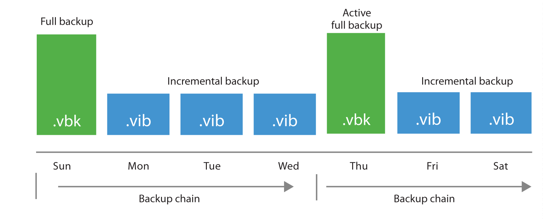 Each time an active full is performed (either on schedule or by manually triggering the Active Full command), a new .VBK file is created by reading all data from the production storage. Following incremental backups are stored in incremental backup files (.VIB).