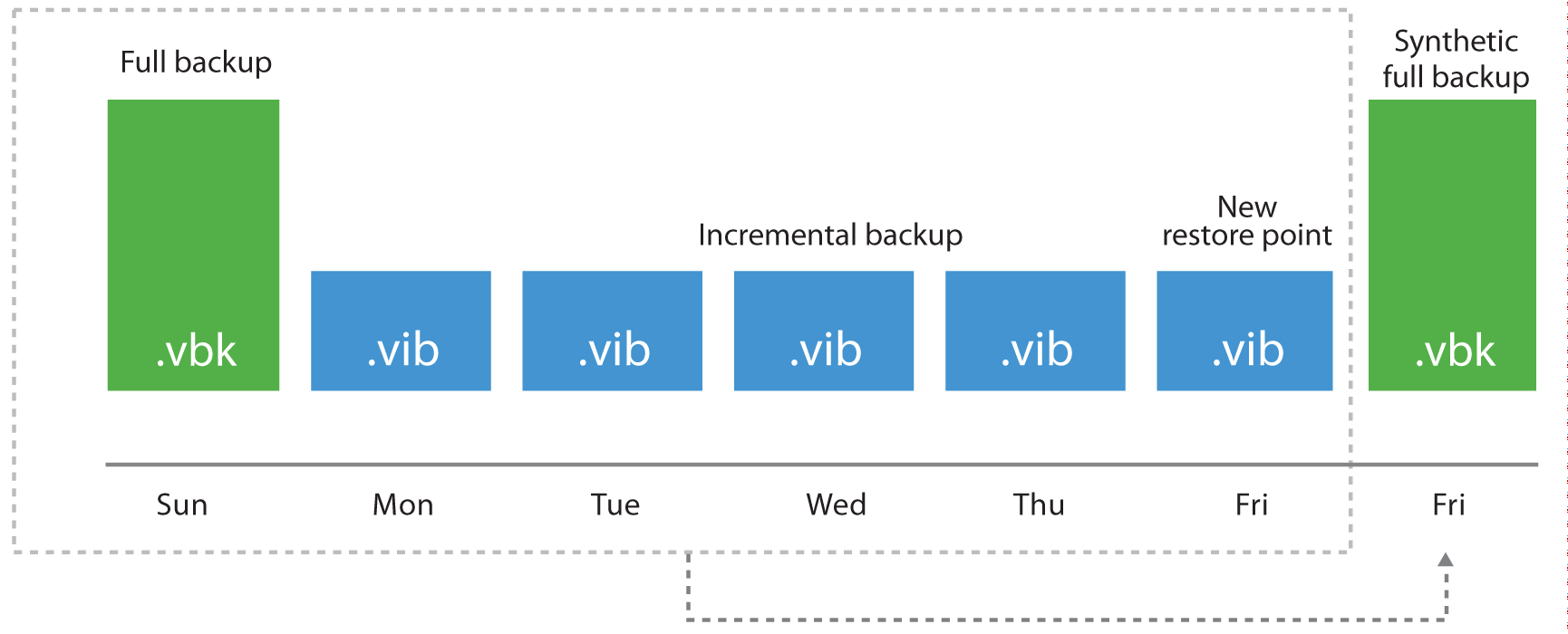 This method provides space-efficient backup, as there is only one full backup to store. It also facilitates retention, since removing old restore points is simply a matter of deleting old VRB files.